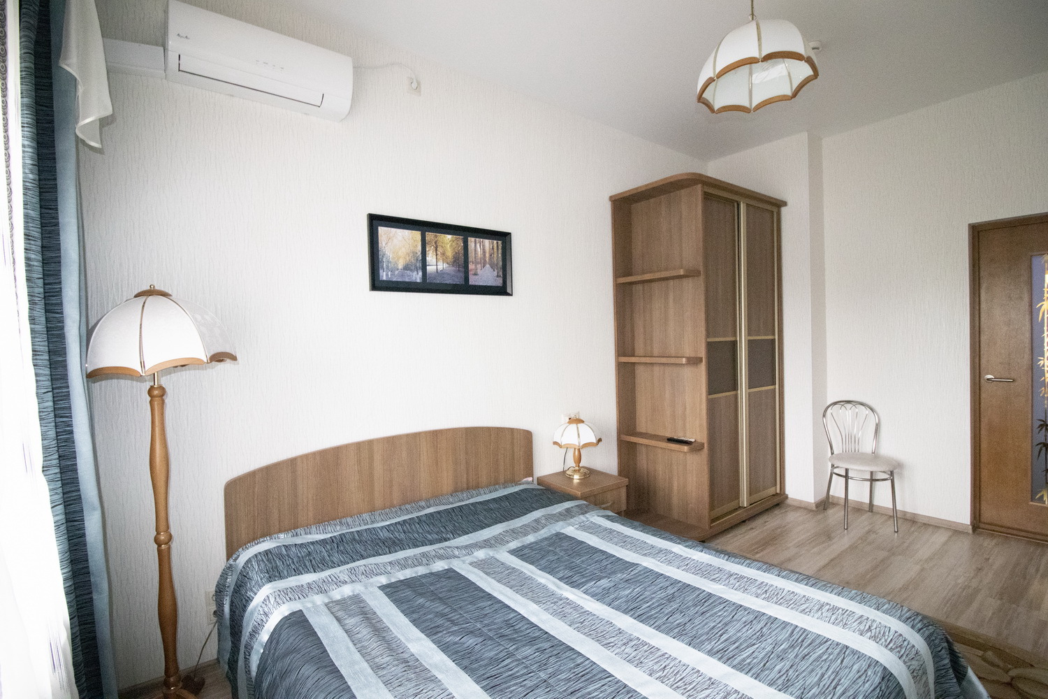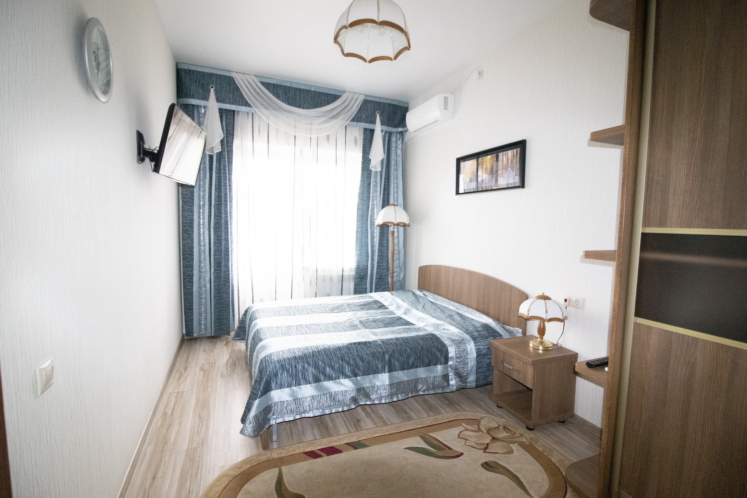 2 осн. места. 2 доп. места. Балкон. Мебель: вешалка, диван, зеркало, кровать двуспальная, прикроватные тумбочки, стол, стулья, шкаф. Мини-кухня. Оборудование: камин, кондиционер, микроволновая печь, сейф, телевизор, холодильник. Санузел: сауна, с ванной или душевой кабиной, с джакузи, тапочки, фен. Сервис: Wi-Fi бесплатно, смена полотенец, смена постельного белья, уборка номера.
