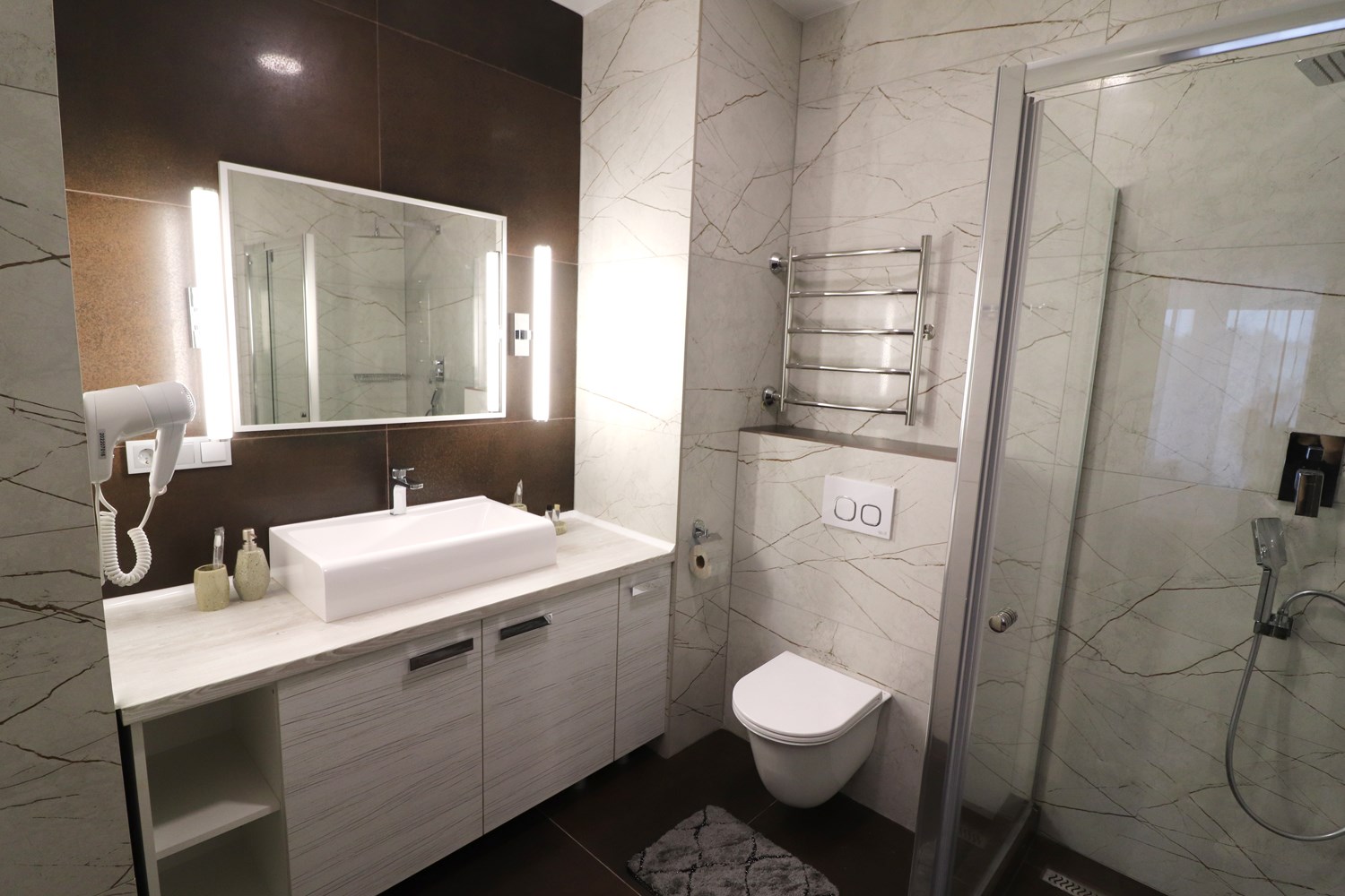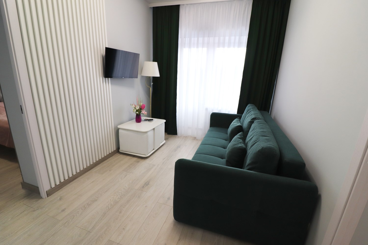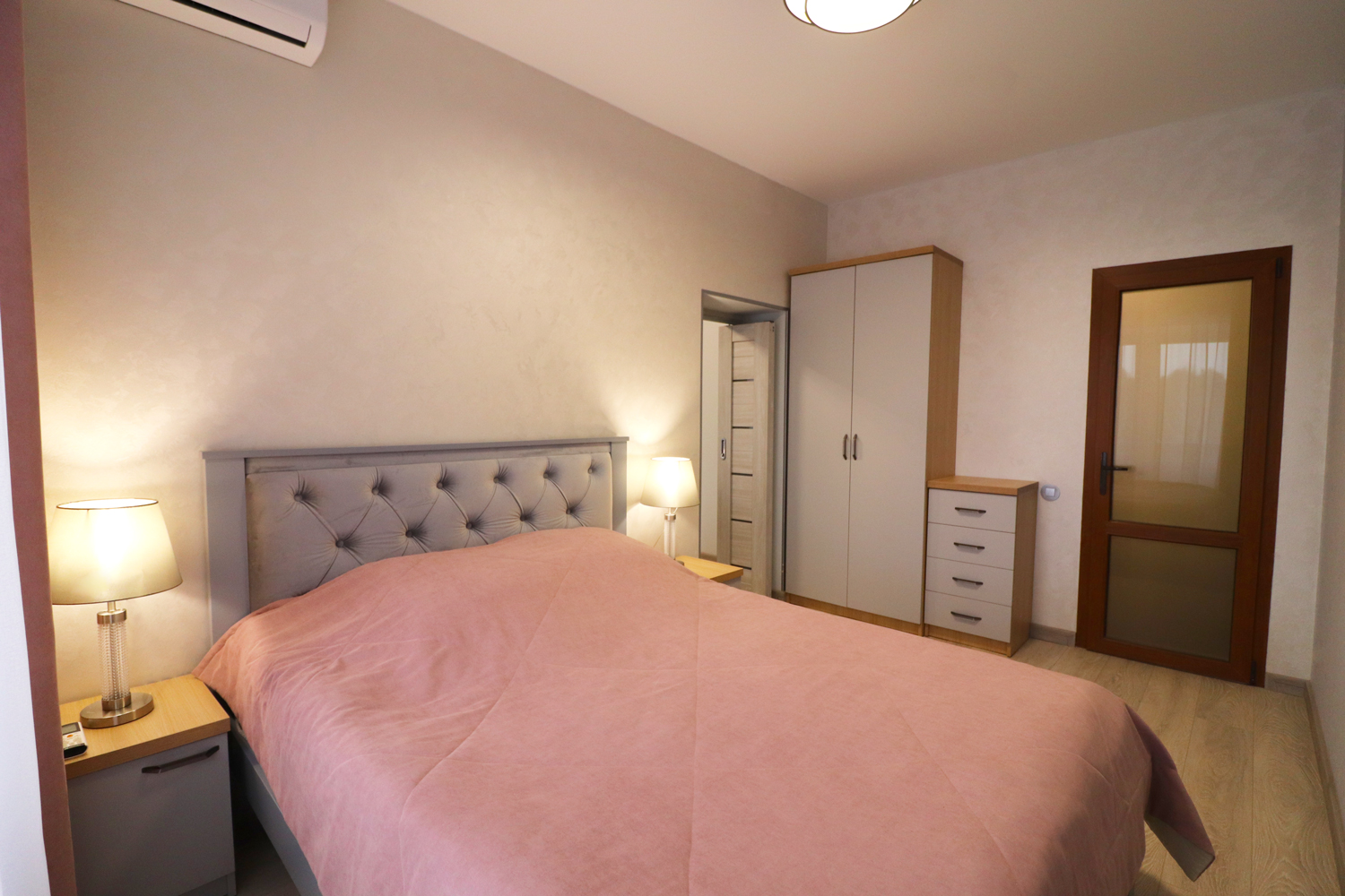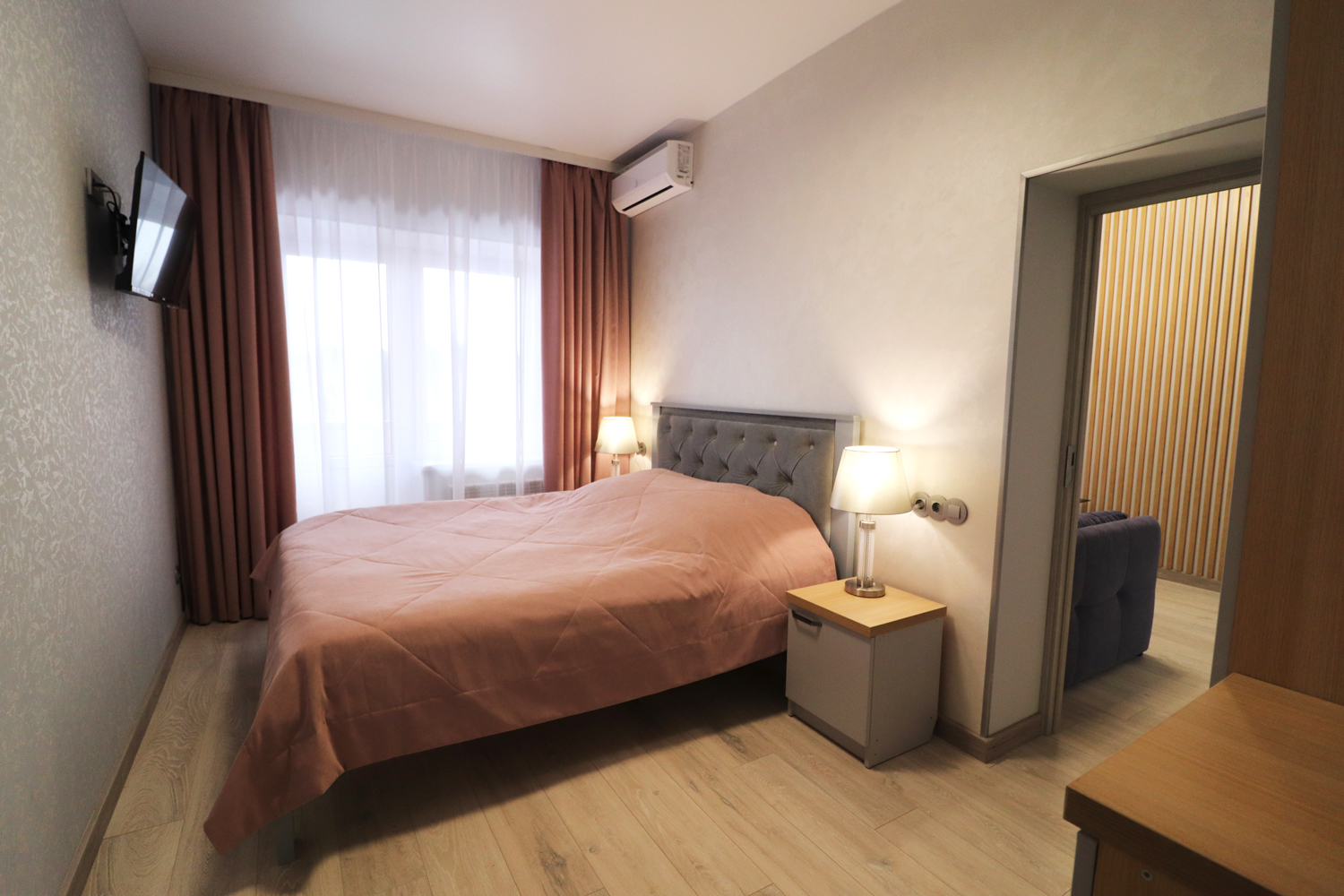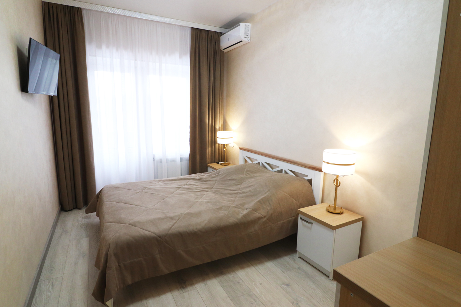 2 осн. места. 2 доп. места. Балкон. Мебель: вешалка, диван, зеркало, кровать двуспальная, прикроватные тумбочки, стол, стулья, шкаф. Мини-кухня. Оборудование: гладильная доска, кондиционер, микроволновая печь, телевизор, утюг, холодильник. Санузел: 2 санузла, с душевой кабиной, туалетные принадлежности, фен. Сервис: Wi-Fi бесплатно, смена полотенец, смена постельного белья, уборка номера.