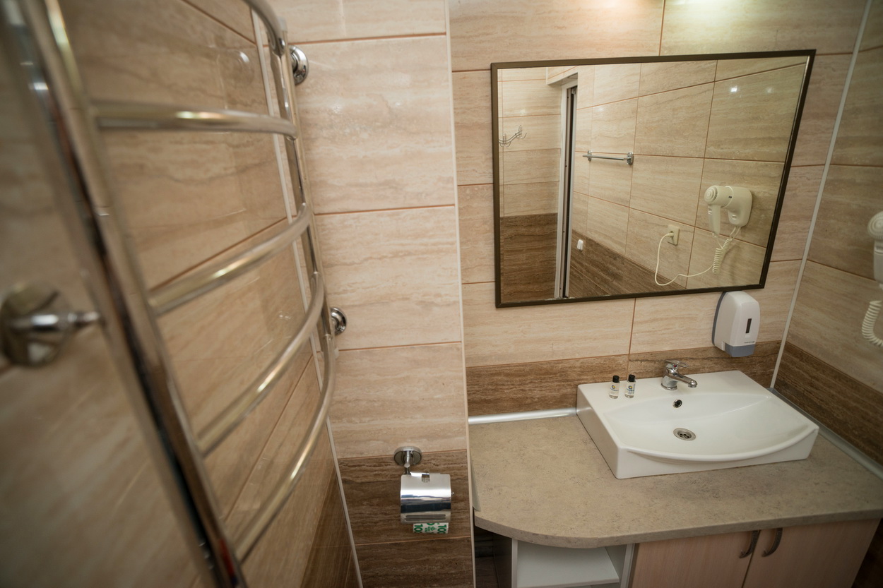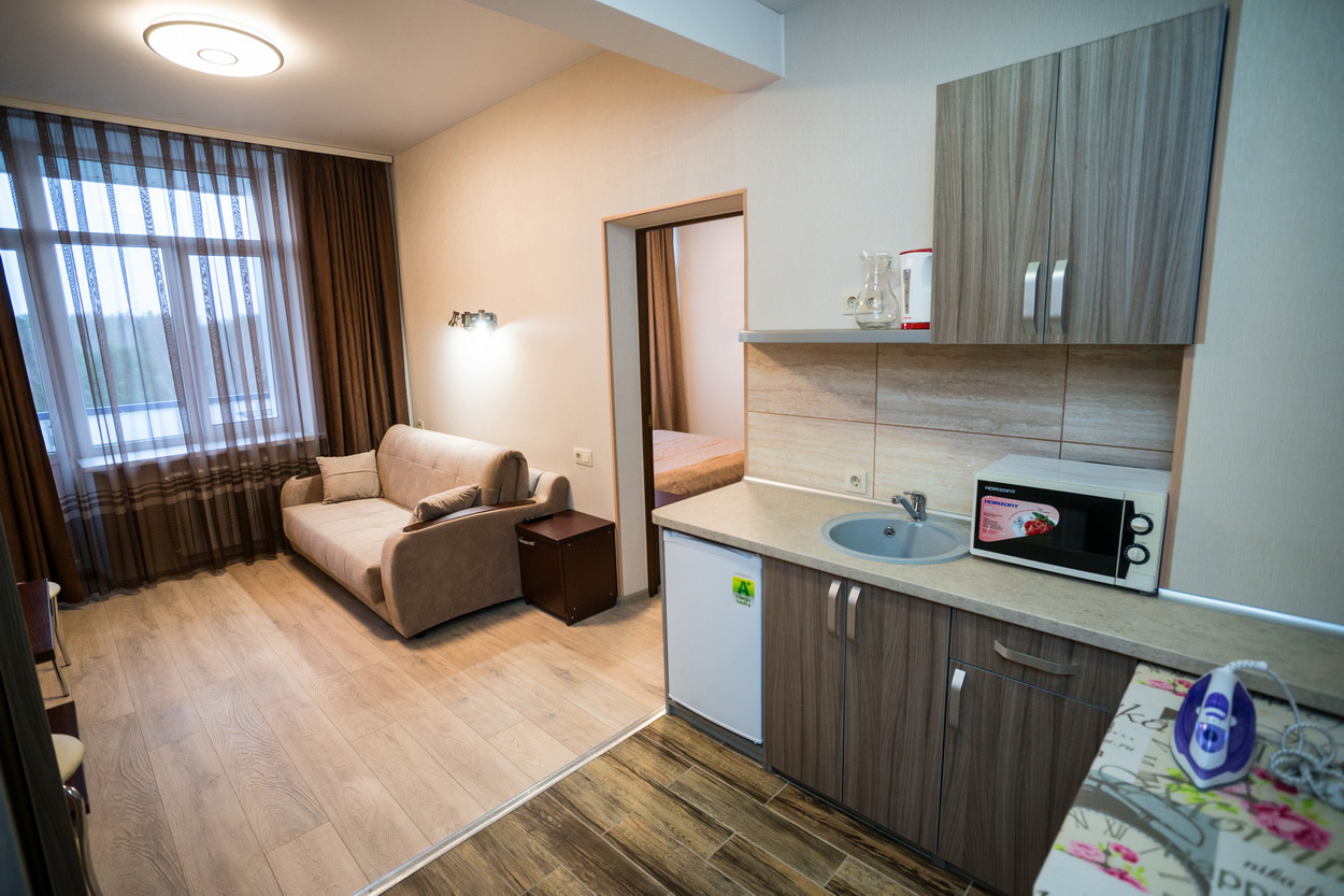 2 осн. места. 2 доп. места. Балкон. Мебель: вешалка, диван, комод, кровать двуспальная, прикроватная тумбочка, стол, столик журнальный, стулья, шкаф-купе. Мини-кухня. Оборудование: гладильная доска, кондиционер, микроволновая печь, телевизор, утюг, холодильник, электрочайник. Санузел: с душем, туалетные принадлежности, фен. Сервис: Wi-Fi бесплатно, смена полотенец, смена постельного белья, уборка номера.