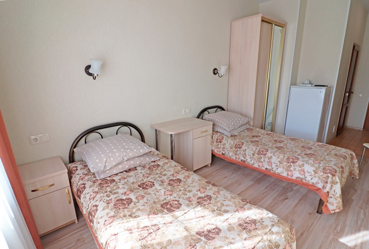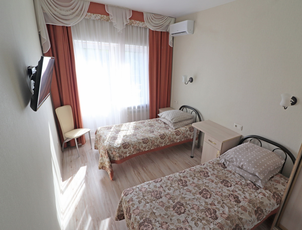2 осн. места. Мебель: вешалка, зеркало, кровати односпальные, прикроватные тумбочки, стол, стул, шкаф. Оборудование: телевизор, холодильник. Санузел: с душем, туалетные принадлежности, фен. Сервис: Wi-Fi бесплатно, смена полотенец, смена постельного белья, уборка номера.