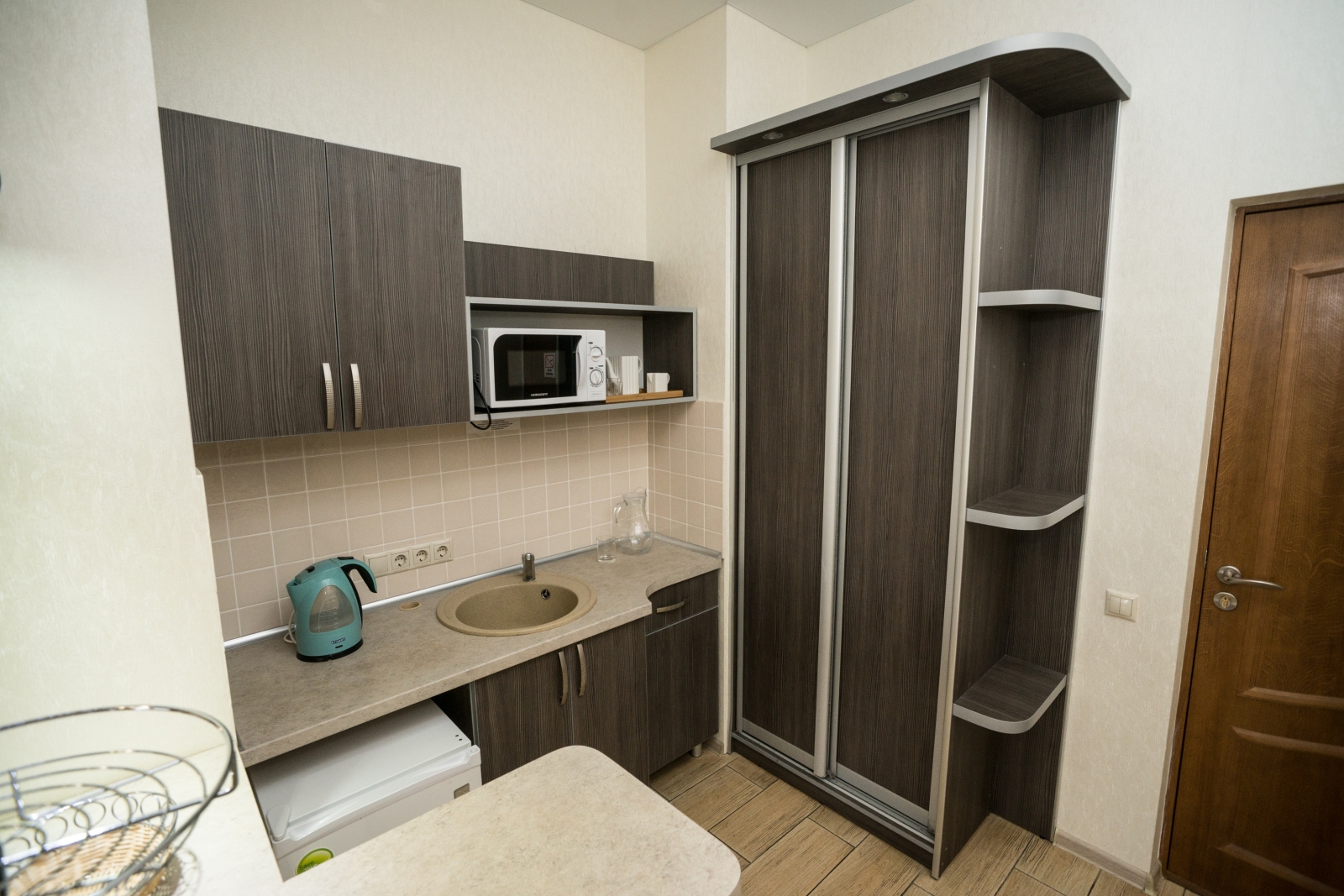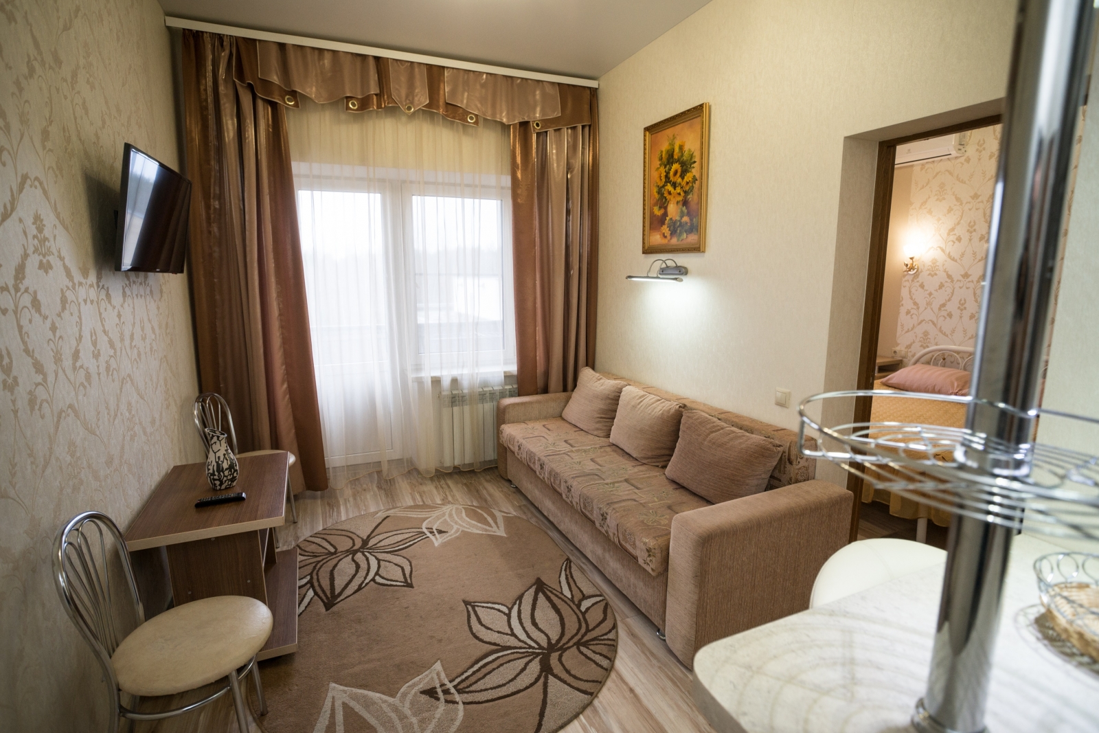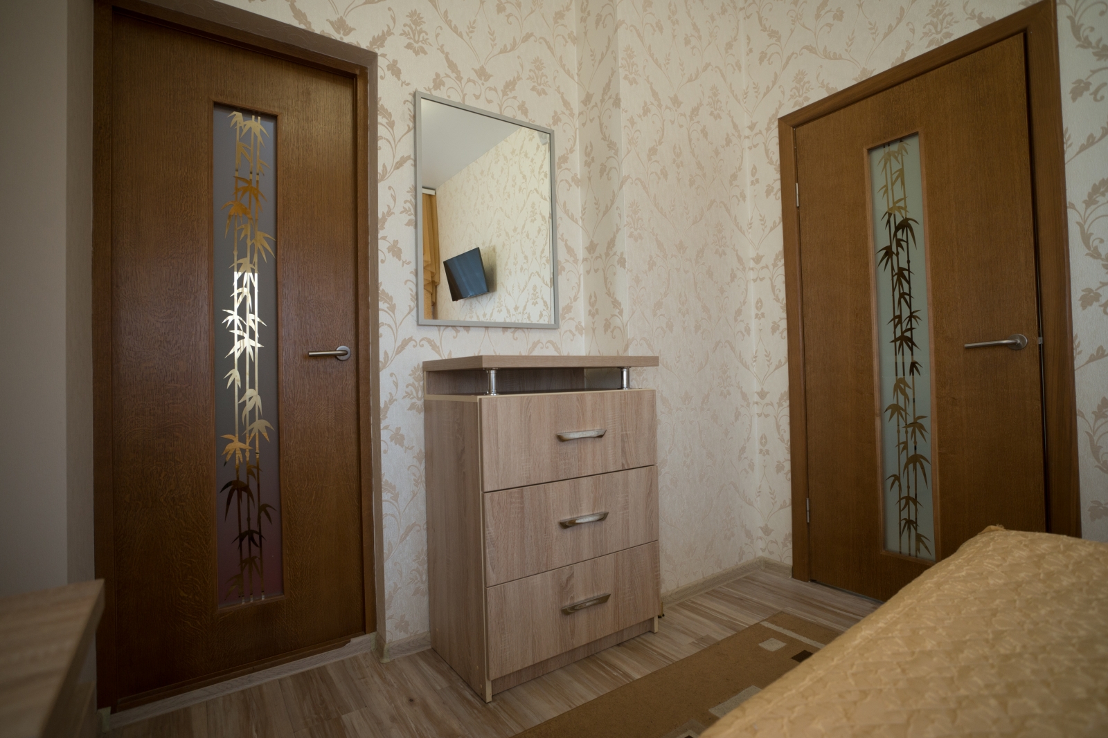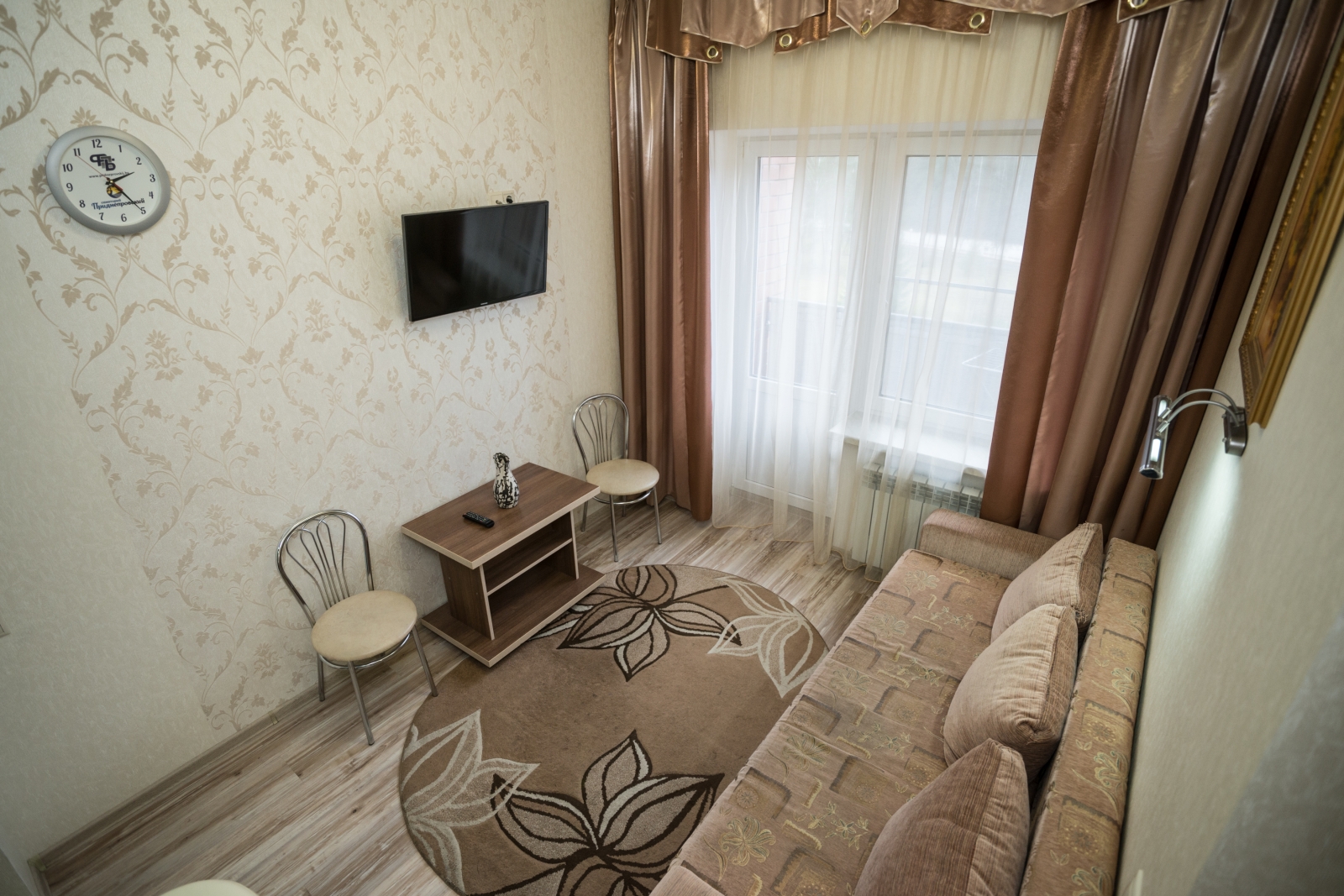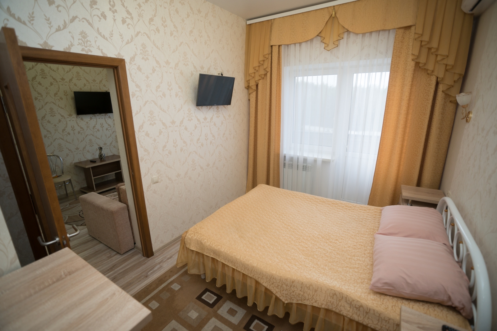 1 осн. место. 1 доп. место. Балкон. Мебель: вешалка, диван, зеркало, комод, кровать двуспальная, прикроватные тумбочки, стол, стулья, шкаф. Мини-кухня. Оборудование: кондиционер, микроволновая печь, мини-холодильник, набор посуды, сейф, телевизор, утюг, холодильник, электрочайник. Санузел: с душем, туалетные принадлежности, фен. Сервис: Wi-Fi бесплатно, смена полотенец, смена постельного белья, уборка номера.